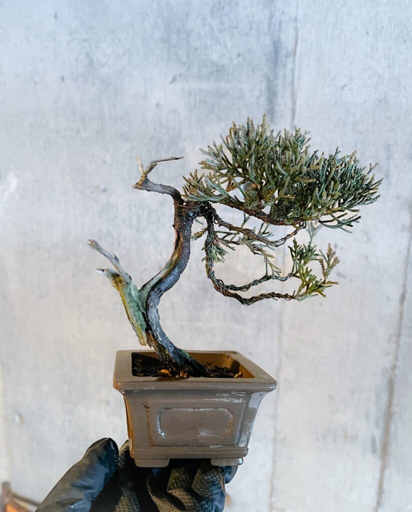 今日は週に一度の水遣りデー。 大品の先輩の棚場の片隅にあった真柏。神のかっこよさに一目惚れして連れ帰りました。まずは下枝に力をつけさせんといかんですね。来春の手入れが楽しみな一鉢! #真柏 #盆栽 #北海道の盆栽 #ベランダ盆栽